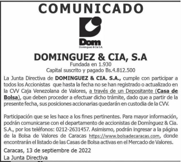 La Junta Directiva de DOMINGUEZ & CIA. S.A., cumple con participar a todos los Accionistas que hasta la fecha no se han registrado o actualizado en la CVV Caja Venezolana de Valores, a través de un Depositante (Casa de Bolsa), que deben proceder a efectuar dicho trámite, dado que a partir de la presente fecha, sus posiciones accionarias quedarán en custodia de la CVV.