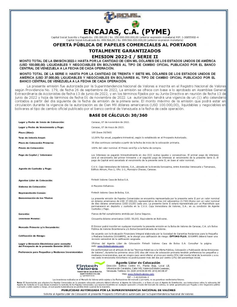 Los títulos hacer colocados son los correspondientes a la Serie II, de la Emisión 2022-I, de Papeles Comerciales, emitidos por la Empresa Emisora, ENCAJAS, C.A. por un monto (USD$ 37.000,00). Negociables y Liquidables en bolívares.