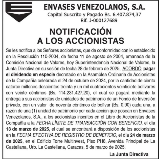 Se les informa a los Señores accionistas, que de conformidad con lo establecido en la Resolución 110-2004, de fecha 11 de agosto de 2004, emanada de la Comisión Nacional de Valores, hoy Superintendencia Nacional de Valores, la Junta Directiva en su sesión de fecha 28 de febrero de 2025. Acordó  pagar el dividendo en especie decretado en la Asamblea Ordinaria de Accionistas celebrada el 24 de octubre de 2024, por la cantidad total de ciento catorce millones doscientos treinta y un mil cuatrocientos veintisiete bolívares con veinte céntimos  (Bs 114.231.427,20) el cual se pagará mediante la entrega a sus accionistas de unidades de patrimonio de un Fondo de Inversión privado, con un valor de bolívares 0,90 cada una, a razón de una (1) unidad de patrimonio por cada acción que posean en Envases Venezolanos, S.A., a los accionistas inscritos en el Libro de Accionistas de la Compañía a la