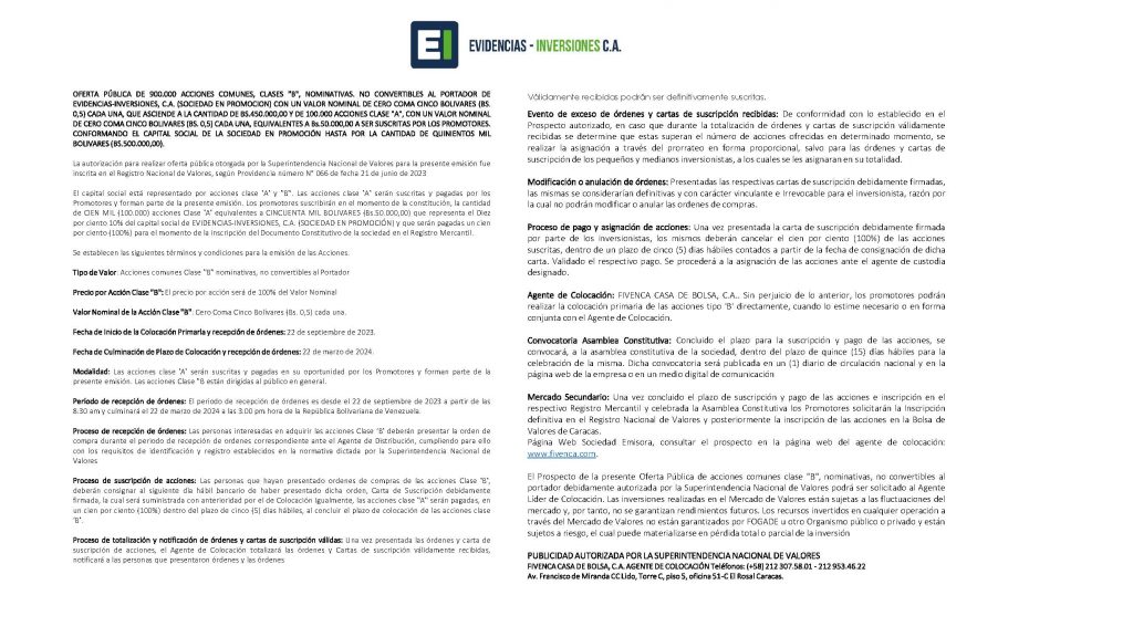 OFERTA PÚBLICA DE 900.000 ACCIONES COMUNES, CLASES “B”, NOMINATIVAS. NO CONVERTIBLES AL PORTADOR DE suscritas. EVIDENCIAS-INVERSIONES, C.A. (SOCIEDAD EN PROMOCION) CON UN VALOR NOMINAL DE CERO COMA CINCO BOLIVARES (BS. 0,5) CADA UNA, QUE ASCIENDE A LA CANTIDAD DE BS.450.000,00 Y DE 100.000 ACCIONES CLASE “A”, CON UN VALOR NOMINAL DE CERO COMA CINCO BOLIVARES (BS. 0,5) CADA UNA, EQUIVALENTES A Bs.50.000,00 A SER SUSCRITAS POR LOS PROMOTORES. CONFORMANDO EL CAPITAL SOCIAL DE LA SOCIEDAD EN PROMOCIÓN HASTA POR LA CANTIDAD DE QUINIENTOS MILBOLIVARES (BS.500.000,00).