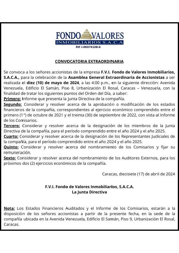 Se convoca a los accionistas de la empresa F.V.I. Fondo de Valores Inmobiliarios, S.A.C.A., para la celebración de la Asamblea General Extraordinaria de Accionistas a ser realizada el diez (10) de mayo de 2024, a las 4:00 p.m., en la siguiente dirección: Avenida Venezuela, Edificio El Samán, Piso 8, Urbanización El Rosal, Caracas-Venezuela con la finalidad de tratar los siguientes puntos del Orden del Día, a saber: