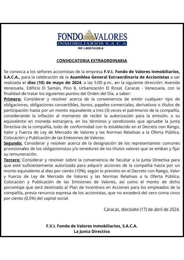 Primero: Considerar y resolver acerca de la conveniencia de emitir cualquier tipo de obligaciones, obligaciones convertibles, bonos, papeles comerciales, derivativos o títulos de participación hasta por un monto equivalente a tres (3) veces el patrimonio de la compañía, considerando la inflación al momento de recibir la autorización para la emisión, o su equivalente en moneda extranjera, en los términos y condiciones que apruebe la Junta Directiva de la compañía, todo de conformidad con lo establecido en el Decreto con Rango, Valor y Fuerza de Ley de Mercado de Valores y las Normas Relativas a la Oferta Pública, Colocación y Publicación de las Emisiones de Valores.