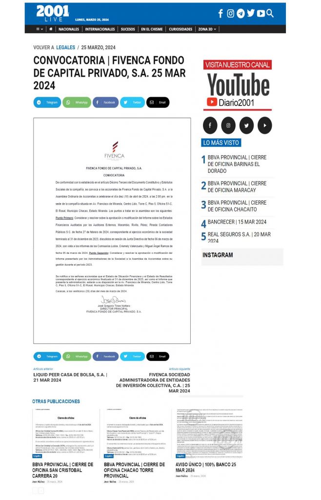 De conformidad con lo establecido en el artículo Decimo Tercero del Documento Constitutivo y Estatutos Sociales de la compañía, se convoca a los accionistas de Fivenca Fondo de Capital Privado, S.A. a la Asamblea Ordinaria de Accionistas a celebrarse el día diez (10) de abril de 2024, a las 2:00 pm en la sede de la compañía situada en Av. Francisco de Miranda, Centro Lido, Torre C, Piso 5, Oficina 51-C, El Rosal, Municipio Chacao, Estado Miranda. Los puntos a tratar en la asamblea son los siguientes: