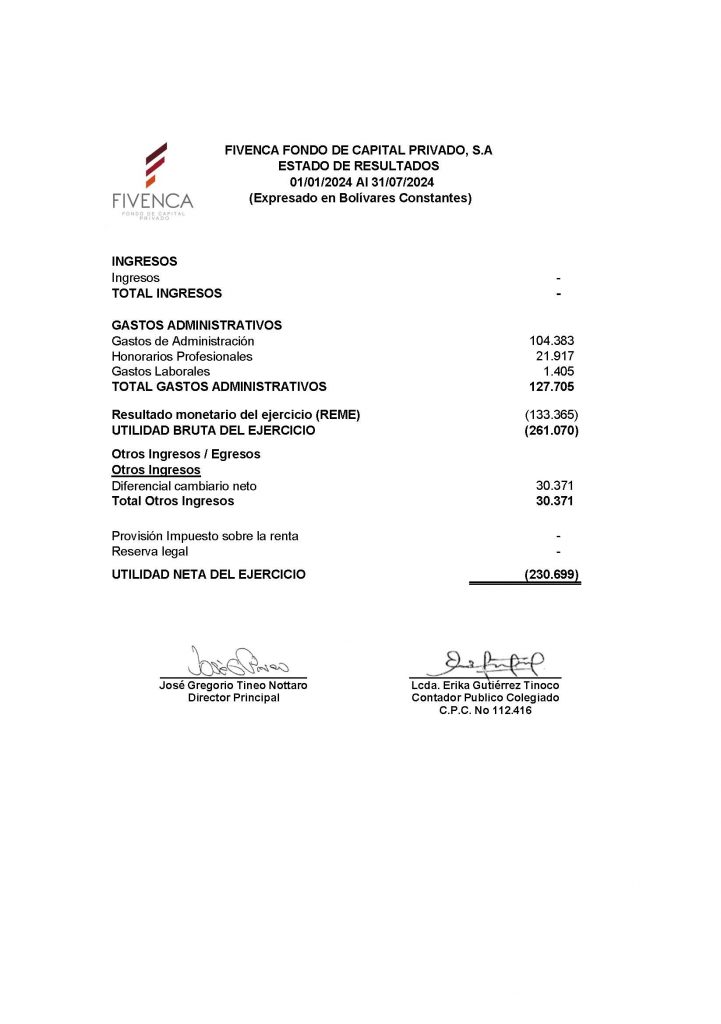 INFORMACIÓN FINANCIERA, Estados Financieros Balance General y Estados de Resultados de Fivenca Fondo de Capital Privado S.A., al cierre de Julio 2024 (NO AUDITADO)