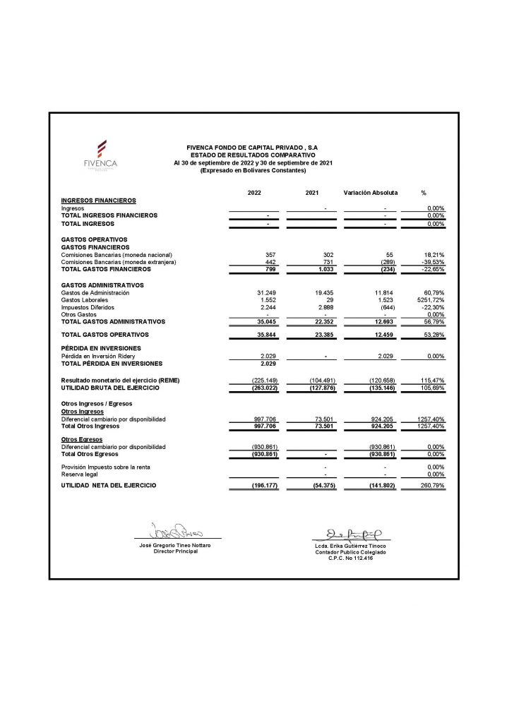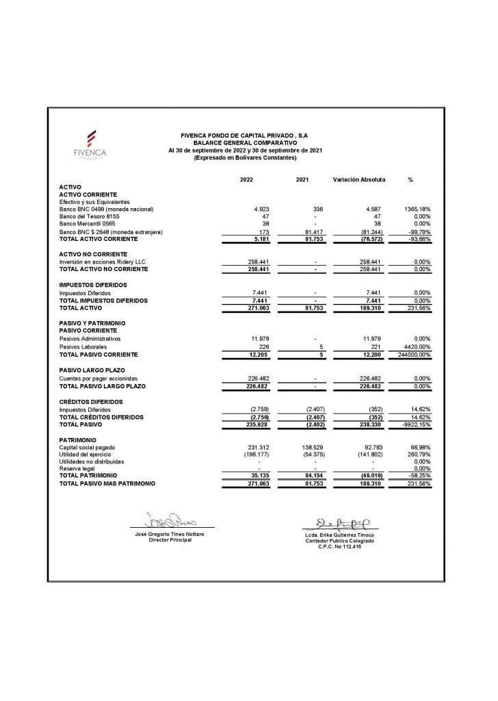 INFORMACIÓN FINANCIERA Estados Financieros Balance General y Estados de Resultados Trimestral de Fivenca Fondo de Capital Privado S.A., al cierre de septiemebre 2022 NO AUDITADO