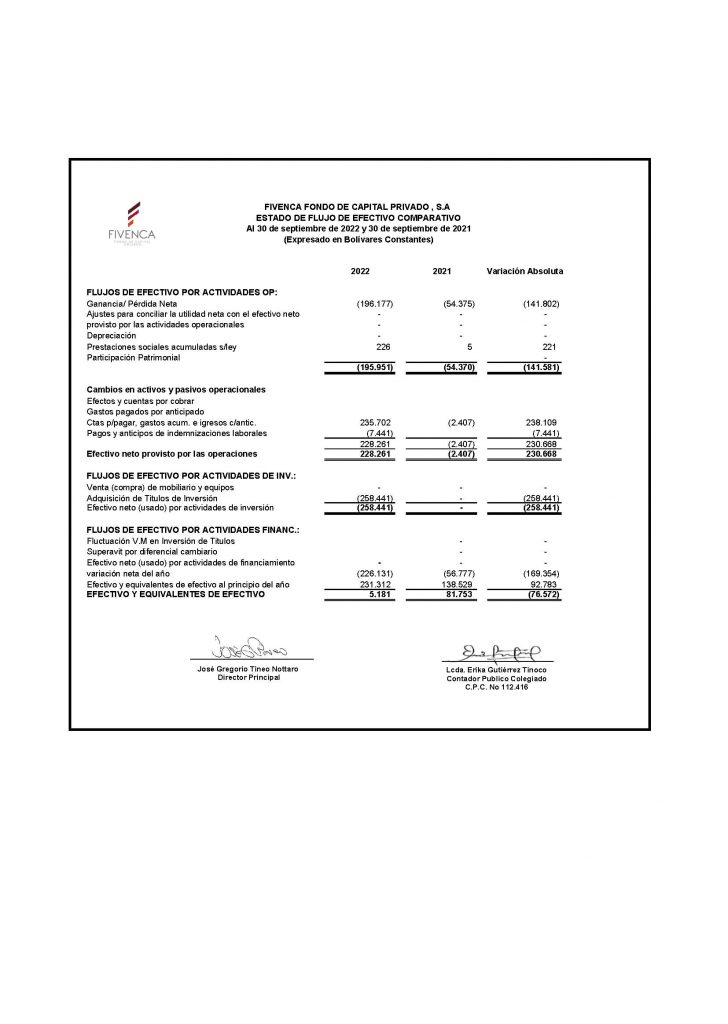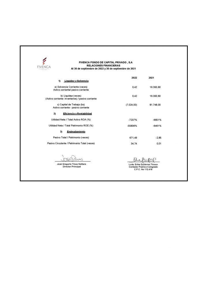FIVENCA FONDO DE CAPITAL PRIVADO S.A. INFORMACIÓN FINANCIERA NO AUDITADO SEPTIEMBRE 2022