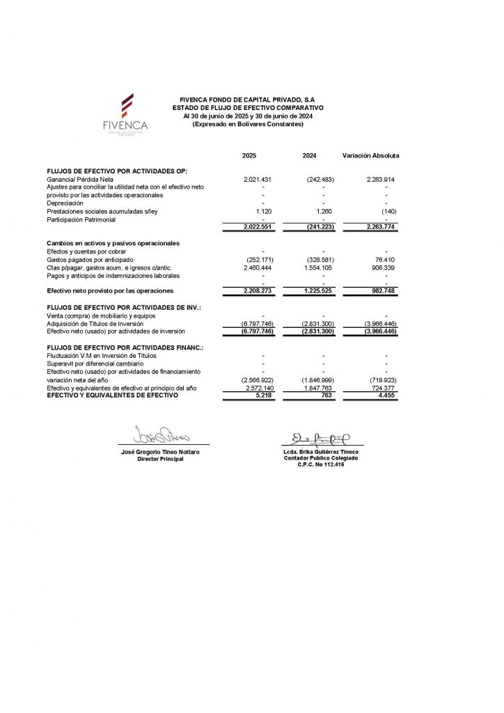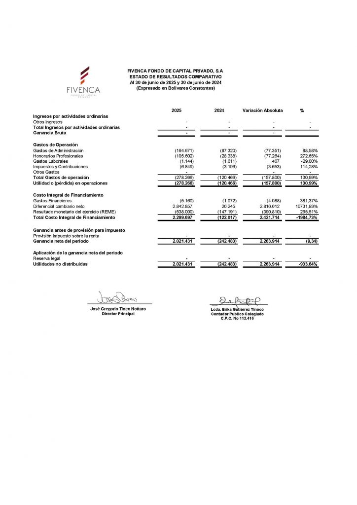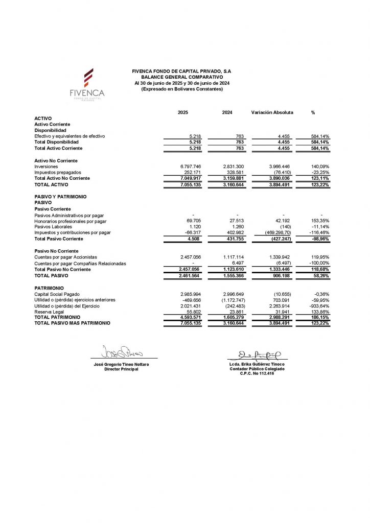 INFORMACIÓN FINANCIERA, Estados Financieros Balance General y Estados de Resultados de Fivenca Fondo de Capital Privado S.A., al cierre de junio 2025 (NO AUDITADO)