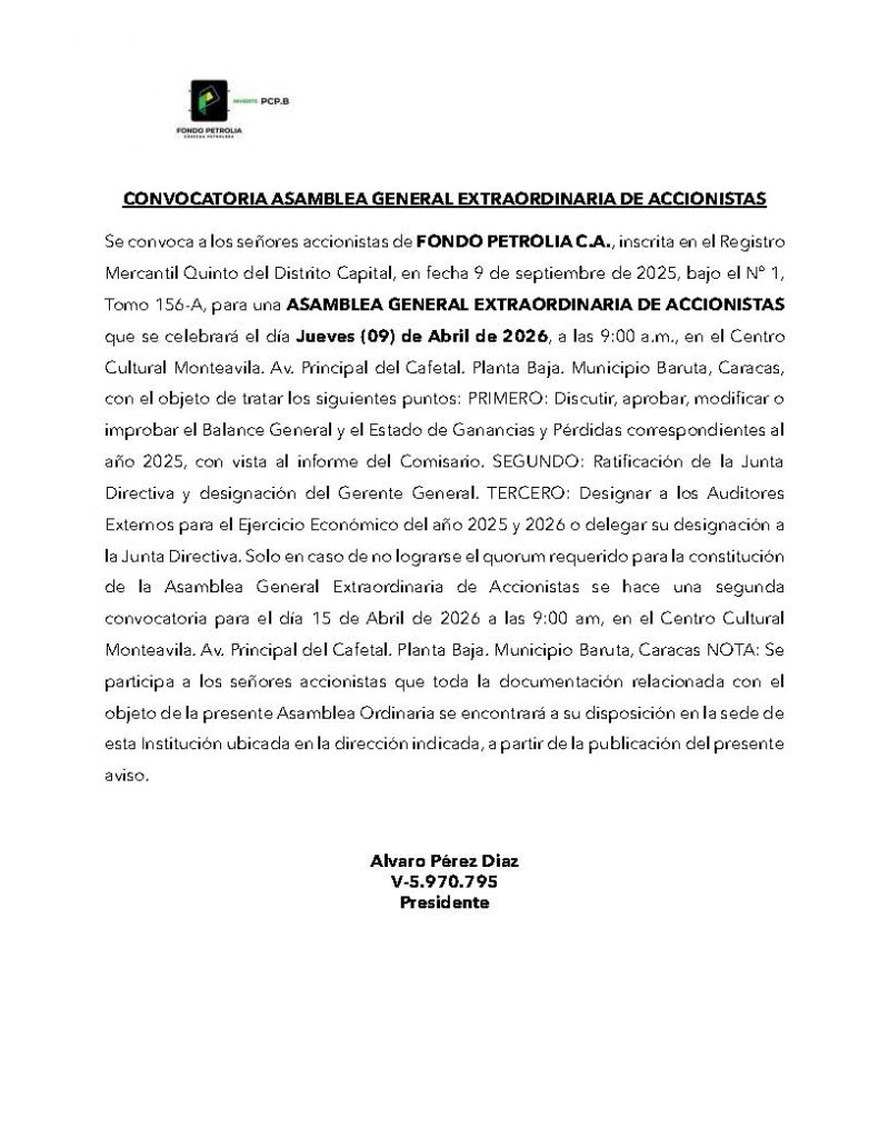 Se convoca a los señores accionistas de FONDO PETROLIA C.A., inscrita en el Registro Mercantil Quinto del Distrito Capital, en fecha 9 de septiembre de 2025, bajo el Nro. 1, Tomo 156-A, para una ASAMBLEA GENERAL EXTRAORDINARIA DE ACCIONISTAS que se celebrará el día Jueves (09) de Abril de 2026, a las 9:00 a.m., en el Centro Cultural Monteavila. Avenida Principal del Cafetal. Planta Baja. Municipio Baruta, Caracas, con el objeto de tratar los siguientes puntos: