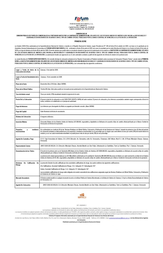 FORUM SUPER MAYORISTA, C.A., EMISIÓN 2025-III, PAPELES COMERCIALES AL PORTADOR