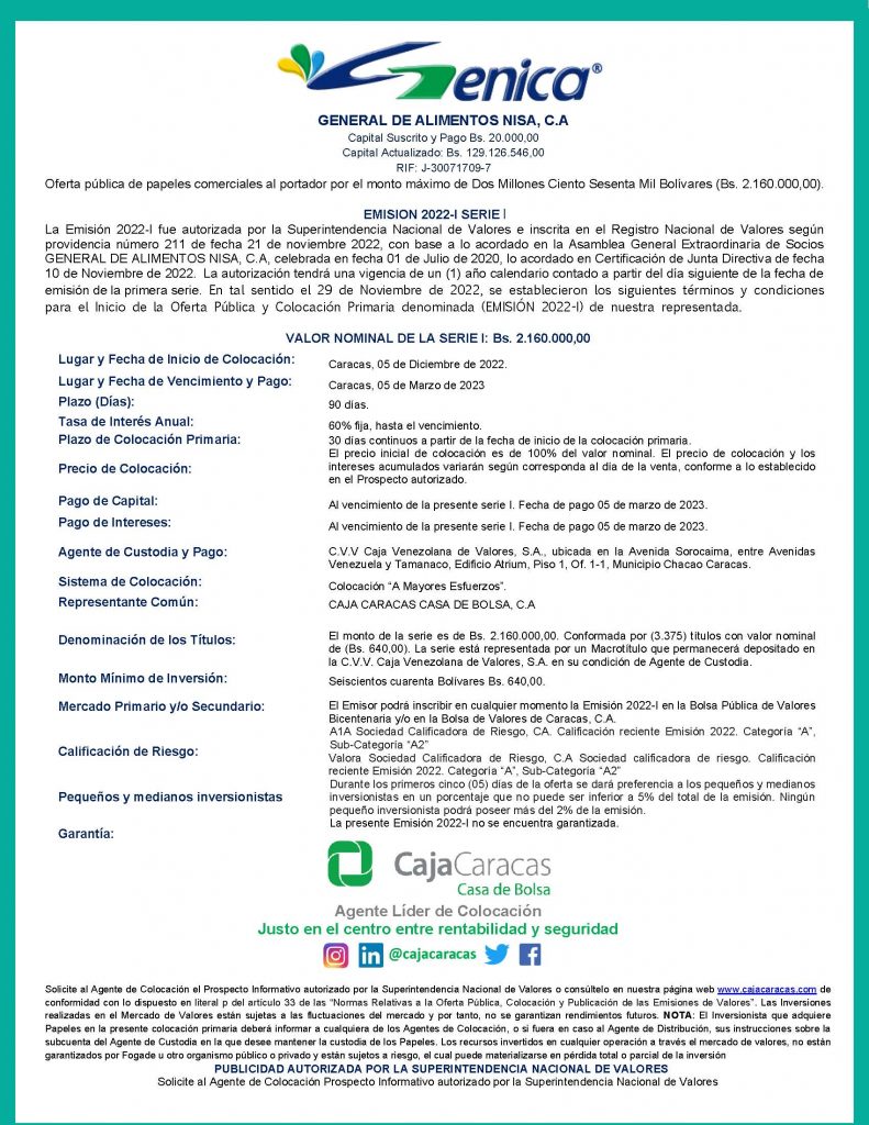 Los títulos para colocar son los correspondientes a la Serie I, de la Emisión 2022-I, de Papeles Comerciales al Portador, emitidos por la Empresa Emisora GENERAL DE ALIMENTOS NISA, C.A.