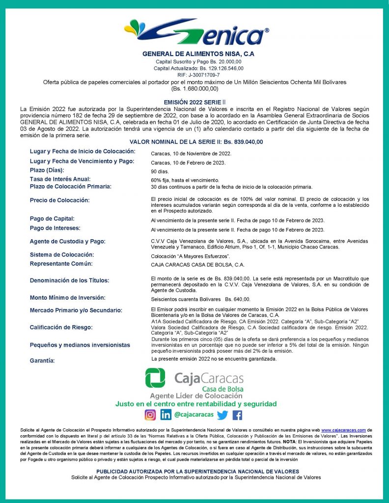 Los títulos para colocar son los correspondientes a la Serie II, de la Emisión 2022, de Papeles Comerciales al Portador, emitidos por la Empresa Emisora GENERAL DE ALIMENTOS NISA, C.A.