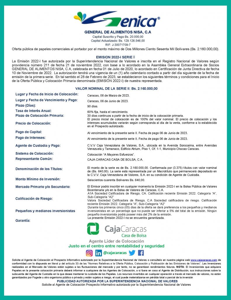 Los títulos para colocar son los correspondientes a la Serie II, de la Emisión 2022-I, de Papeles Comerciales al Portador, emitidos por la Empresa Emisora GENERAL DE ALIMENTOS NISA, C.A.