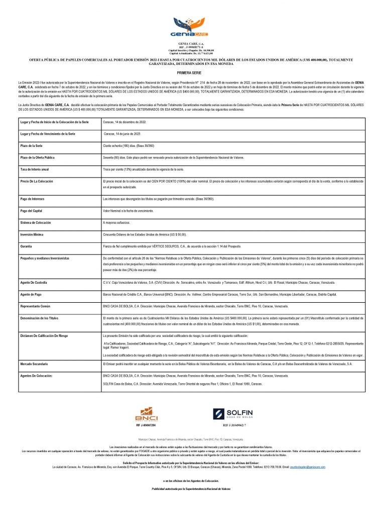 La Bolsa de Valores de Caracas, en su carácter institucional por promover el Mercado de Valores de Renta Fija del sector primario, informa a los Miembros del Mercado de la Bolsa de Valores de Caracas y al Público en General, sobre las características y condiciones de la Colocación Primaria de Papeles Comerciales de GENIA CARE, C.A., a realizarse a través del Sistema Integrado Bursátil Electrónico (SIBE).