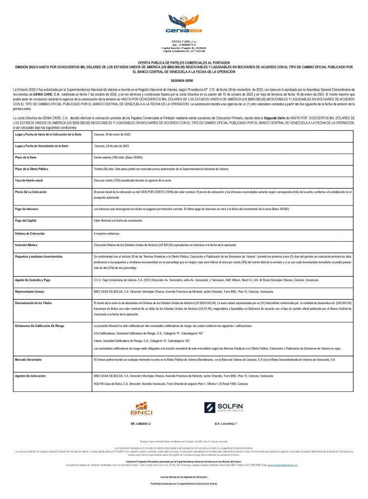 La Bolsa de Valores de Caracas, en su carácter institucional por promover el Mercado de Valores de Renta Fija del sector primario, informa a los Miembros del Mercado de la Bolsa de Valores de Caracas y al Público en General, sobre las características y condiciones de la Colocación Primaria de Papeles Comerciales de GENIA CARE, C.A., a realizarse a través del Sistema Integrado Bursátil Electrónico (SIBE).