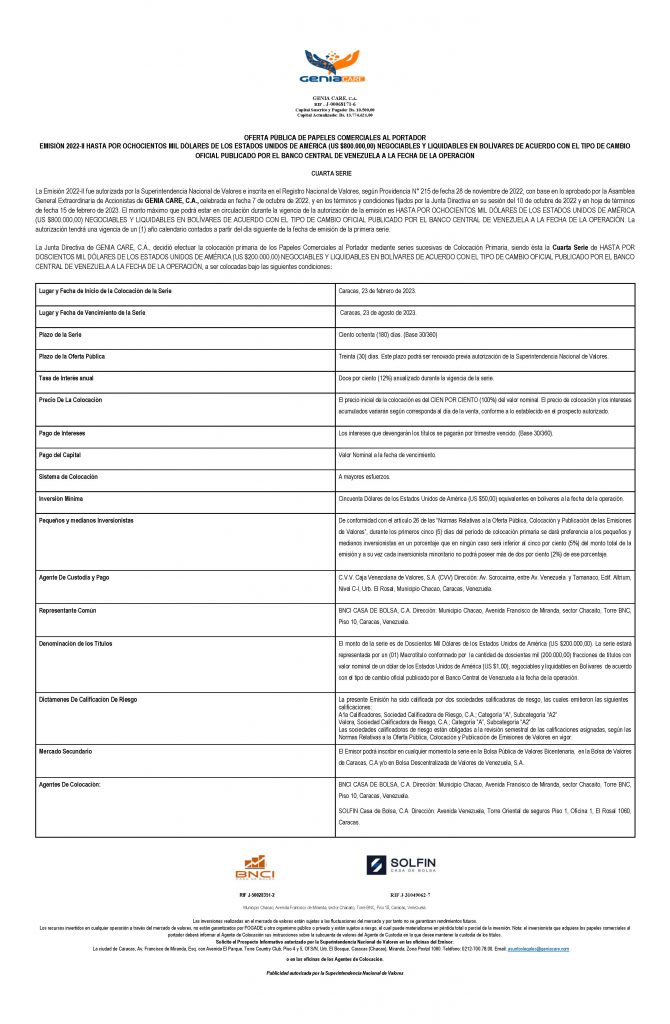 Los títulos para colocar son los correspondientes a la Serie IV, de la Emisión 2022-II, de Papeles Comerciales de GENIA CARE, C.A., con denominación en dólares de los Estados Unidos de América (USD$).
