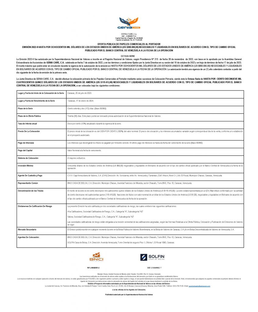 Los títulos para colocar son los correspondientes a la Serie VIII, de la Emisión 2022-II, de Papeles Comerciales de GENIA CARE, C.A., con denominación en dólares de los Estados Unidos de América (USD$).