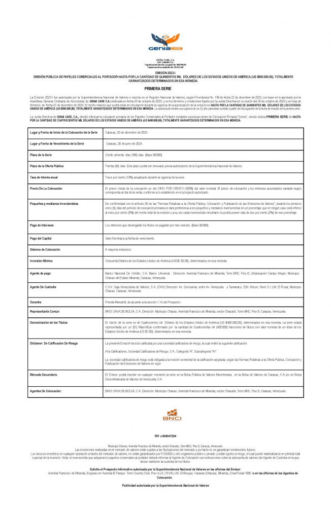 | Emisor | GENIA CARE, C.A., |