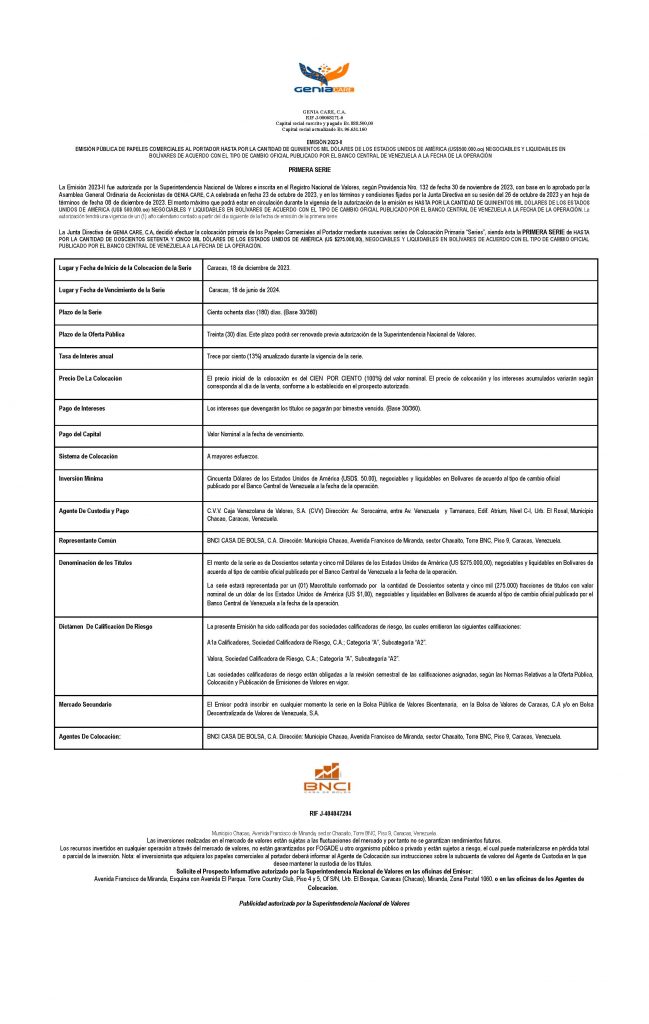 La Bolsa de Valores de Caracas, en su carácter institucional por promover el Mercado de Valores de Renta Fija del sector primario, informa a los Miembros del Mercado de la Bolsa de Valores de Caracas y al Público en General, sobre las características y condiciones de la Colocación Primaria de Papeles Comerciales de GENIA CARE, C.A., a realizarse a través del Sistema Integrado Bursátil Electrónico (SIBE).