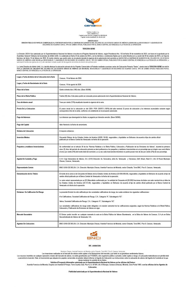 | Emisor | GENIA CARE, C.A., |