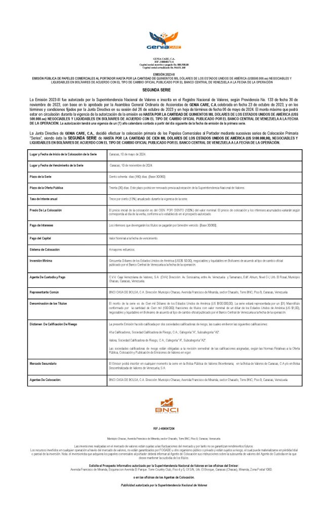 GENIA CARE, C.A., EMISIÓN 2023-III PAPELES COMERCIALES AL PORTADOR