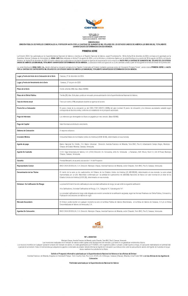 La Bolsa de Valores de Caracas, en su carácter institucional por promover el Mercado de Valores de Renta Fija del sector primario, informa a los Miembros del Mercado de la Bolsa de Valores de Caracas y al Público en General, sobre las características y condiciones de la Colocación Primaria de Papeles Comerciales de GENIA CARE, C.A., a realizarse a través del Sistema Integrado Bursátil Electrónico (SIBE).