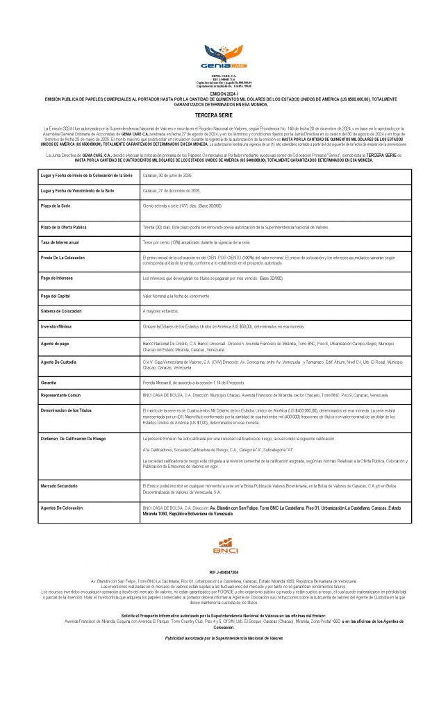 La Bolsa de Valores de Caracas, en su carácter institucional por promover el Mercado de Valores de Renta Fija del sector primario, informa a los Miembros del Mercado de la Bolsa de Valores de Caracas y al Público en General, sobre las características y condiciones de la Colocación Primaria de Papeles Comerciales de GENIA CARE, C.A., a realizarse a través del Sistema Integrado Bursátil Electrónico (SIBE).