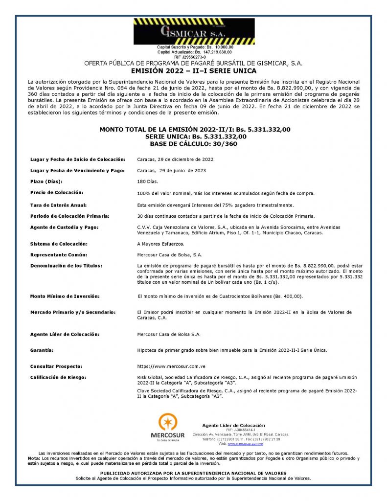 La Bolsa de Valores de Caracas, en su carácter institucional por promover el Mercado de Valores de Renta Fija del sector primario, informa a los Miembros de la Bolsa de Valores de Caracas y al público en general, sobre las características y condiciones de la Colocación Primaria de la Primera Emisión del Programa de Pagare Bursátil, de GISMICAR, S.A., a realizarse a través del Sistema Integrado Bursátil Electrónico (SIBE).