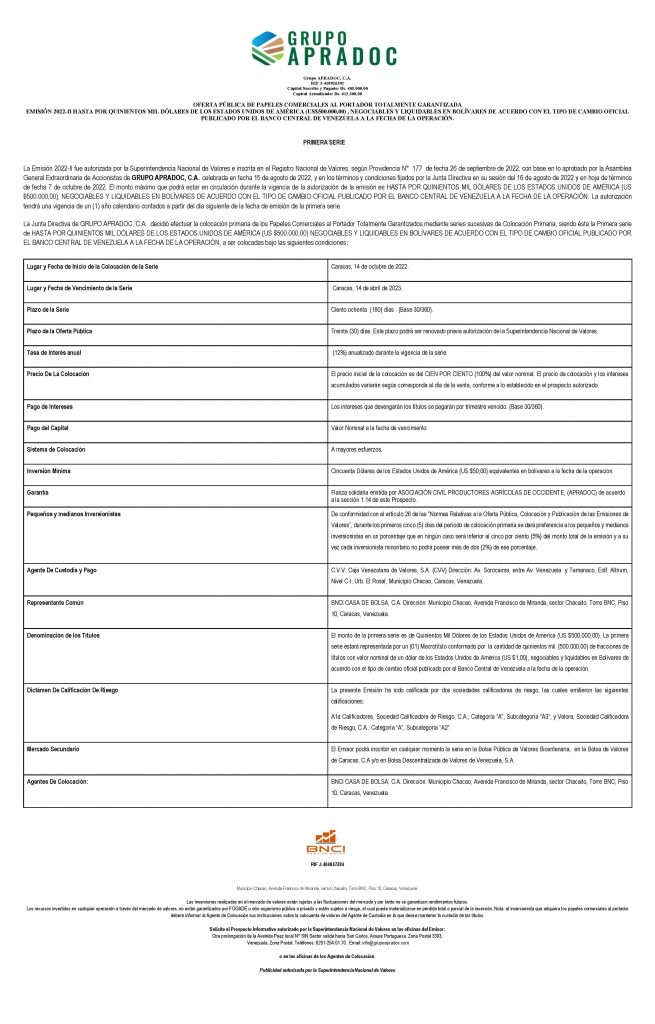 Colocación Primaria de Papeles Comerciales al Portador Totalmente garantizada Emisión 2022-II Serie I Monto USD$ 500.000,00, Negociables y liquidables en Bolivares de acuerdo con el tipo de cambio Oficial publicado por el Banco Central De Venezuela a la fecha de la Operación.