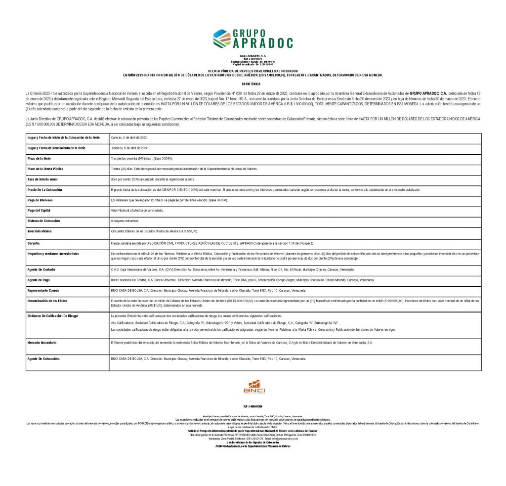 La Bolsa de Valores de Caracas, en su carácter institucional por promover el Mercado de Valores de Renta Fija del sector primario, informa a los Miembros del Mercado de la Bolsa de Valores de Caracas y al Público en General, sobre las características y condiciones de la Colocación Primaria de Papeles Comerciales de GRUPO APRADOC, C.A., a realizarse a través del Sistema Integrado Bursátil Electrónico (SIBE).