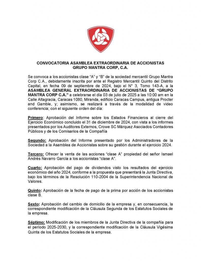 Se convoca a los accionistas clase “A” y “B” de la sociedad mercantil Grupo Mantra Corp C.A., debidamente inscrita por ante el Registro Mercantil Quinto del Distrito Capital, en fecha 09 de septiembre de 2024, bajo el Nro. 3, Tomo 143-A, a la ASAMBLEA GENERAL EXTRAORDINARIA DE ACCIONISTAS DE “GRUPO MANTRA CORP C.A.” a celebrarse el día 03 de julio de 2025 a las 10:00 am en la Calle Altagracia, Caracas 1080, Miranda, edificio Caracas Campus, antigua Procter and Gamble, y; asimismo, se realizará a través de la modalidad de video conferencia; con el siguiente orden del día:
