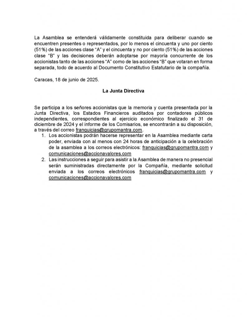 Nota: Se participa a los señores accionistas que la memoria y cuenta presentada por la Junta Directiva, los Estados Financieros auditados por contadores públicos independientes, correspondientes al ejercicio económico finalizado el 31 de diciembre de 2024 y el informe de los Comisarios, se encontrarán a su disposición, a través del correo franquicias@grupomantra.com.