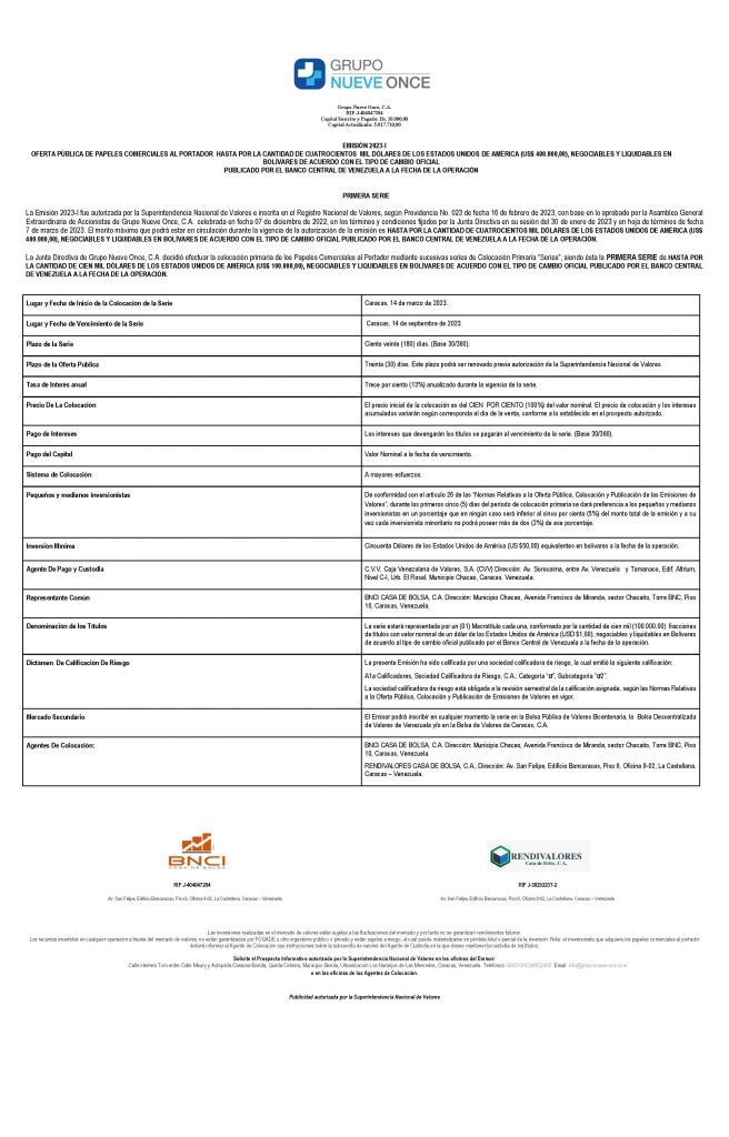 Los títulos para colocarse son los correspondientes a la Serie I, de la Emisión 2023-I, de Papeles Comerciales al Portador, emitidos por la Empresa Emisora GRUPO NUEVE ONCE, C.A.