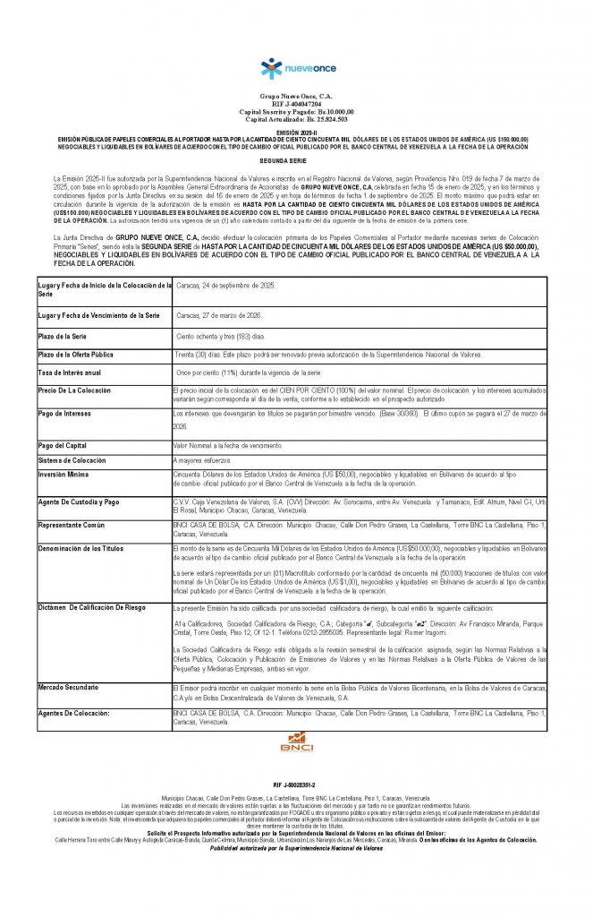 Los títulos para colocarse son los correspondientes a la Serie II, de la Emisión 2025-II, de Papeles Comerciales al Portador, emitidos por la Empresa Emisora GRUPO NUEVE ONCE, C.A. Negociables y liquidables en bolívares.