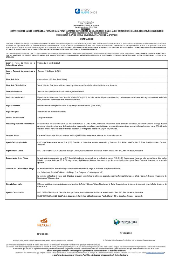 Los títulos para colocarse son los correspondientes a la Serie IV, de la Emisión 2023-I, de Papeles Comerciales al Portador, emitidos por la Empresa Emisora GRUPO NUEVE ONCE, C.A.