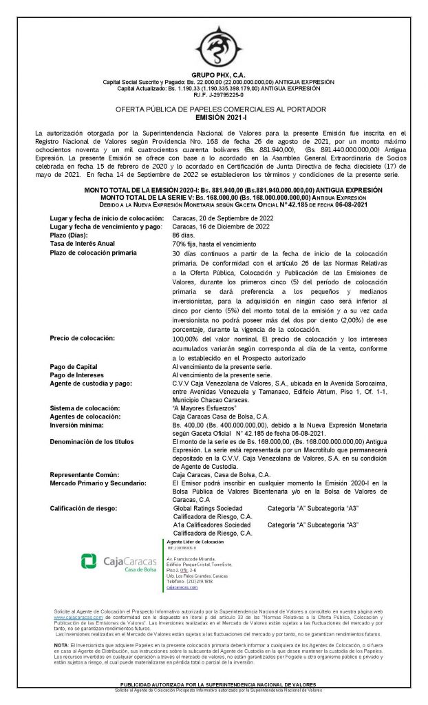 Los títulos para colocar son los correspondientes a la Serie V, de la Emisión 2021-I, de Papeles Comerciales al Portador, emitidos por la Empresa Emisora GRUPO PHX, C. A.