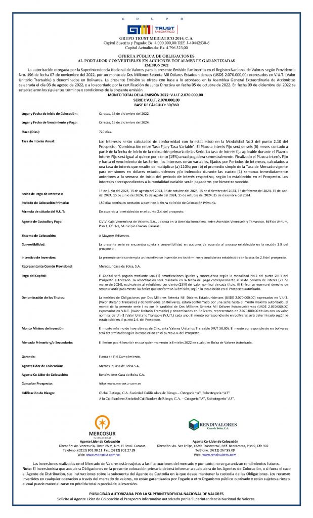 | Emisor | GRUPO TRUST MEDIATICO 2014, C.A. |