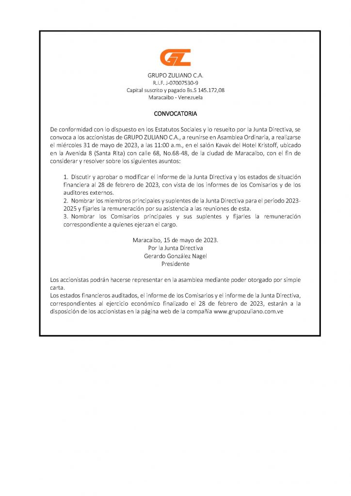 De conformidad con lo dispuesto en los estatutos Sociales y lo resuelto por la Junta Directiva, se convoca a los accionistas de GRUPO ZULIANO C.A., a reunirse en Asamblea Ordinaria, a realizarse el miércoles 31 de mayo de 2023, a las 11:00 a.m., en el salón Kavak del Hotel Kristoff, ubicado en 1a Avenida 8 (Santa Rita) con calle 68, No.68- 48, de la ciudad de Maracaibo, con el fin de considerar y resolver sobre los siguientes asuntos: