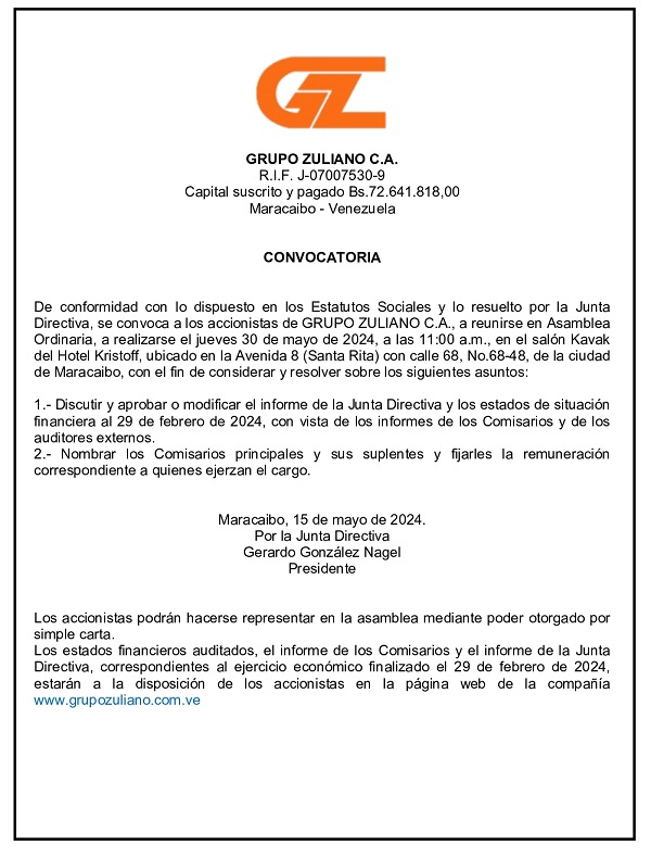 De conformidad con lo dispuesto en los Estatutos Sociales y lo resuelto por la Junta Directiva, se convoca a los accionistas de GRUPO ZULIANO C.A., a reunirse en Asamblea Ordinaria, a realizarse el jueves 30 de mayo de 2024, a las 11:00 a.m., en el salón Kavak del Hotel Kristoff, ubicado en la Avenida 8 (Santa Rita) con calle 68, No.68-48, de la ciudad de Maracaibo, con el fin de considerar y resolver sobre los siguientes asuntos: