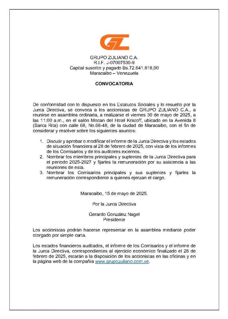 De conformidad con lo dispuesto en los Estatutos Sociales y lo resuelto por la Junta Directiva, se convoca a los accionistas de GRUPO ZULIANO C.A., a reunirse en asamblea ordinaria, a realizarse el viernes 30 de mayo de 2025, a las 11:00 a.m., en el salón Mocan del Hotel Kristoff, ubicado en la Avenida 8 (Santa Rita) con calle 68, No.68-48, de la ciudad de Maracaibo, con el fin de considerar y resolver sobre los siguientes asuntos: