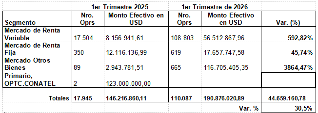 En general, la Bolsa de Valores de Caracas finalizó el primer trimestre de 2026, con un monto total negociado de 190.876.020,89 dólares, es decir, un alza de 44.659.160,78 dólares (+30,5%), frente al mismo período de 2025. Las operaciones en la institución bursátil se realizan en bolívares, para esta nota se expresaron en dólares al tipo de cambio oficial para facilitar el análisis comparativo del mercado.