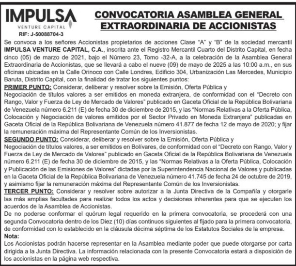 Se convoca a los señores Accionistas propietarios de acciones Clase “A” y “B” de la sociedad mercantil IMPULSA VENTURE CAPITAL, C.A., inscrita en el Registro Mercantil Cuarto de la Circunscripción Judicial del Distrito Capital, en fecha 05 de marzo de 2021, bajo el No. 23, Tomo 32-A, a la celebración de la Asamblea General Extraordinaria de Accionistas, que se llevará a cabo el nueve (09) de mayo de 2025 a las 10:00 a.m. en sus oficinas ubicadas en la Calle Orinoco con Calle Londres, Edif. 304 piso 4, Las Mercedes, Municipio Baruta, Distrito Capital, con la finalidad de tratar los siguientes puntos: