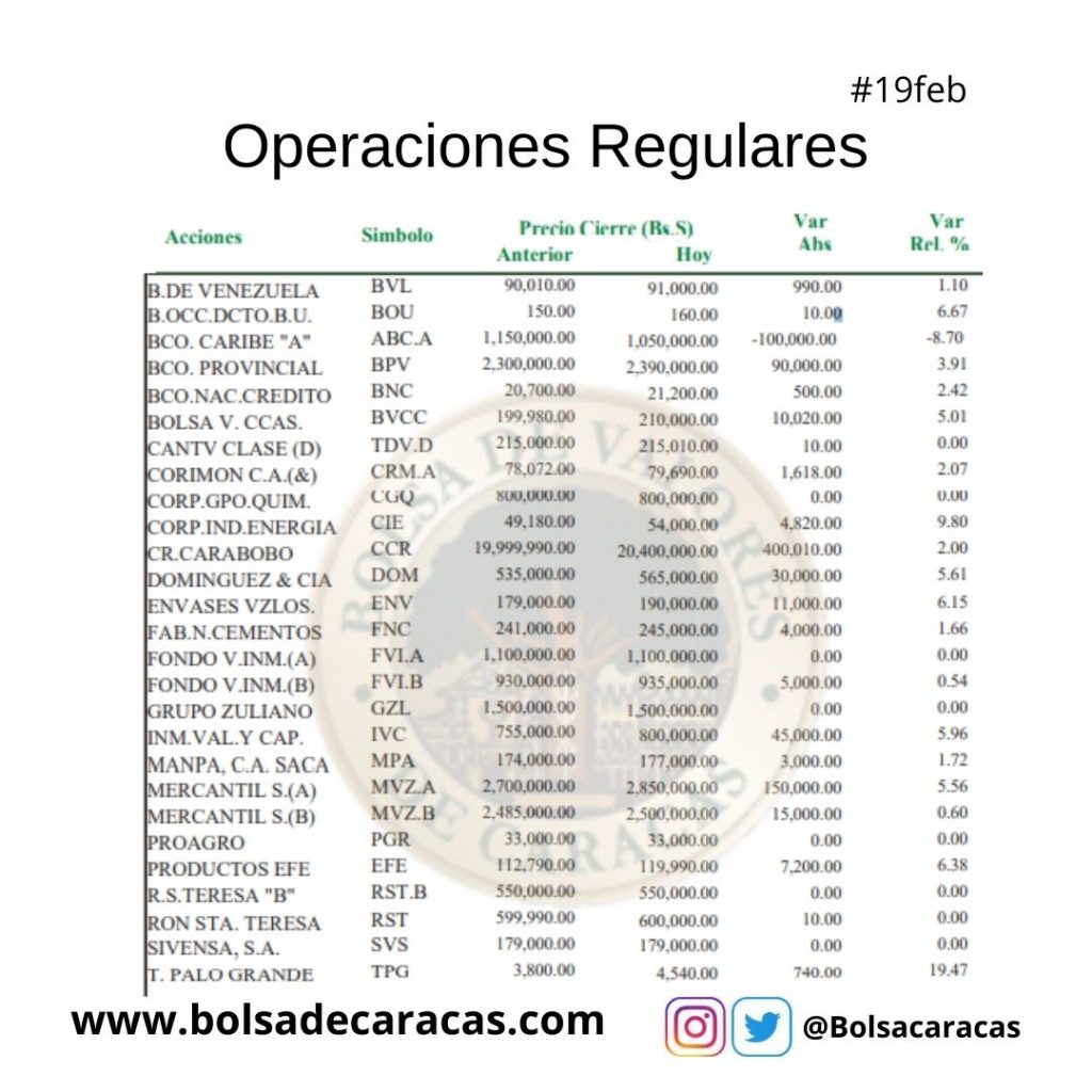 En el mercado a plazo se negociaron 16 mil 122 acciones por un monto de 15 mil 047 millones 169 mil 800 bolívares.