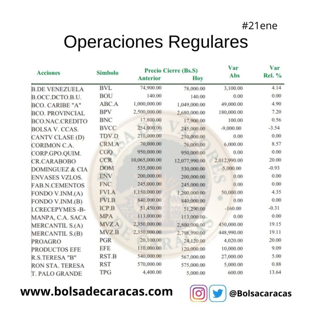 Se efectuaron en Bolsa 157 operaciones de compra y venta de acciones de las empresas inscritas en la pizarra de cotizaciones, en las cuales se transaron 13 millones 696 mil 081 acciones por 256 mil 948 millones 476 mil 390 bolívares.
