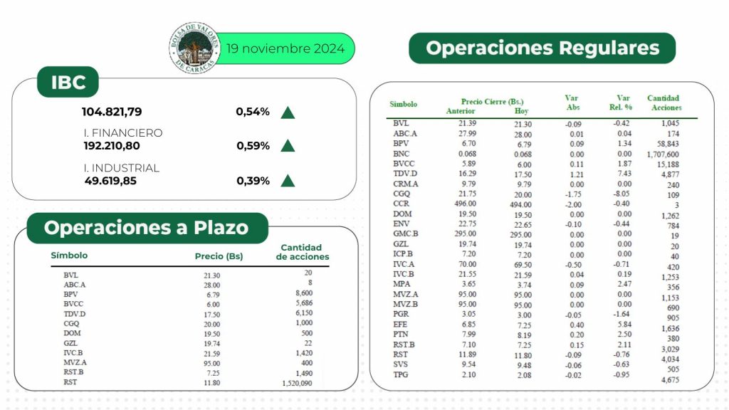 El índice principal de la Bolsa de Valores de Caracas, el IBC, culminó este martes en 104.821,79 puntos con una variación de 565,56 puntos (+0,54%), con respecto a la sesión anterior.