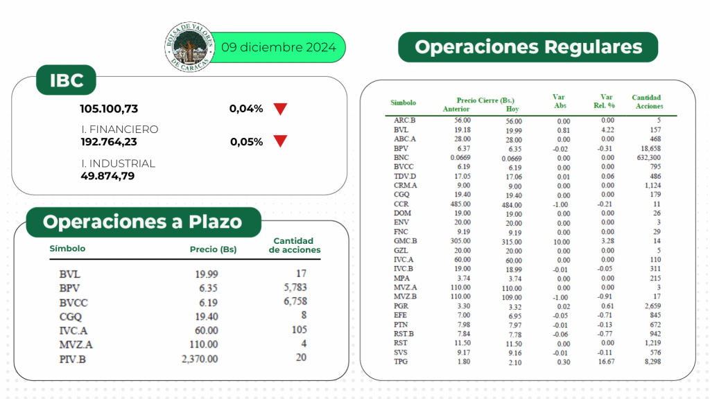 El índice principal de la Bolsa de Valores de Caracas, el IBC, culminó este lunes en 105.100,73 puntos con una variación de 42,66 puntos (-0,04%), con respecto a la sesión anterior.