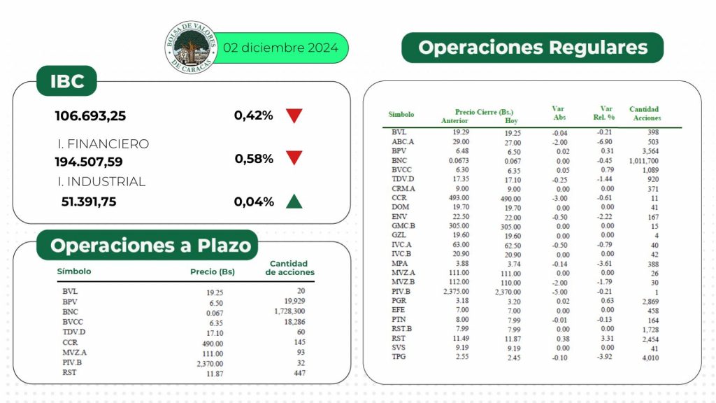 El índice principal de la Bolsa de Valores de Caracas, el IBC, culminó este lunes en 106.693,25 puntos con una variación de 454,30 puntos (-0,42%), con respecto a la sesión anterior.