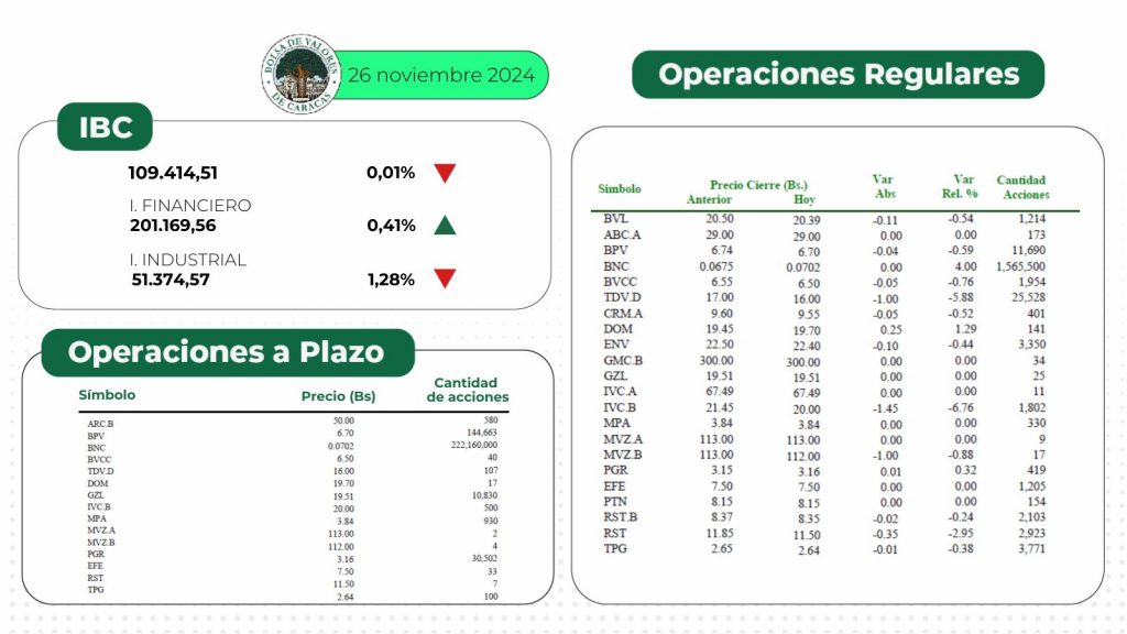 El índice principal de la Bolsa de Valores de Caracas, el IBC, culminó este martes en 109.414,51 puntos con una variación de 12,04 puntos (-0,01%), con respecto a la sesión anterior.