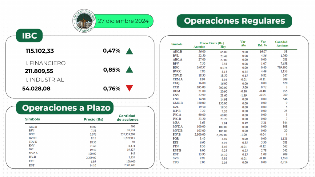 El índice principal de la Bolsa de Valores de Caracas, el IBC, culminó este viernes en 115.102,33 puntos con una variación de 541,95 puntos (+0,47%), con respecto a la sesión anterior.