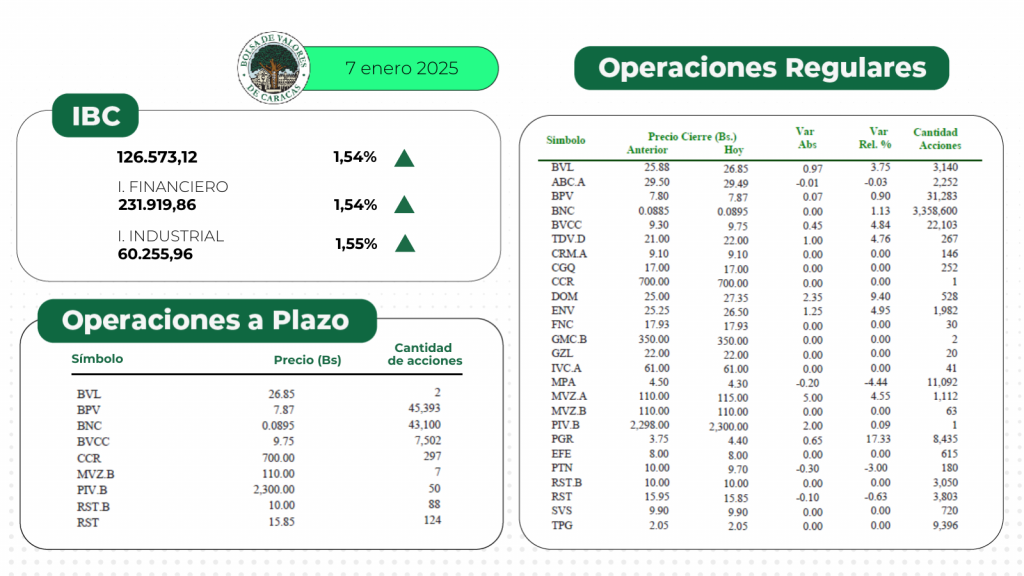 El índice principal de la Bolsa de Valores de Caracas, el IBC, culminó este martes en 126.573,12 puntos con una variación de 1.925,17 puntos (+1,54%), con respecto a la sesión anterior.