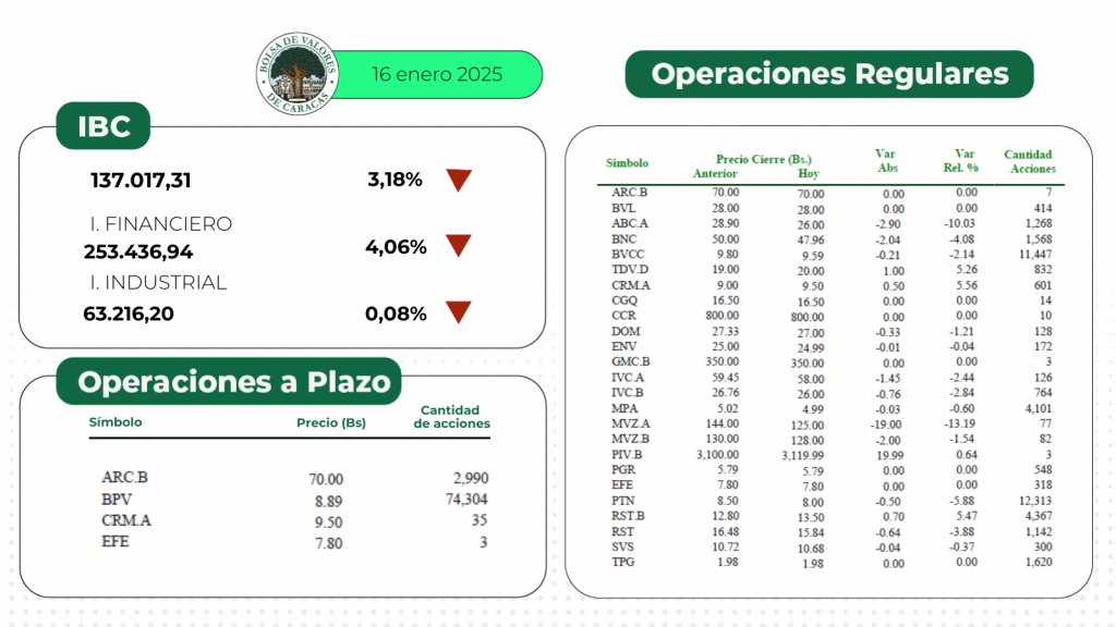 El índice principal de la Bolsa de Valores de Caracas, el IBC, culminó este jueves en 137.017,31 puntos con una variación de 4.506,03 puntos (-3,18%), con respecto a la sesión anterior.